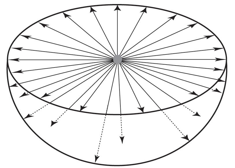 Fig. 3. Sunburst effect of α-damage trails. The sunburst pattern of α-damage trails produces a spherically colored shell around the halo radiocenter. Each arrow represents approximately 5 million α-particles emitted from the radiocenter. Radiohalo coloration initially develops after about 100 million α-decays, becomes darker after about 500 million, and very dark after about 1 billion (after Gentry 1988).