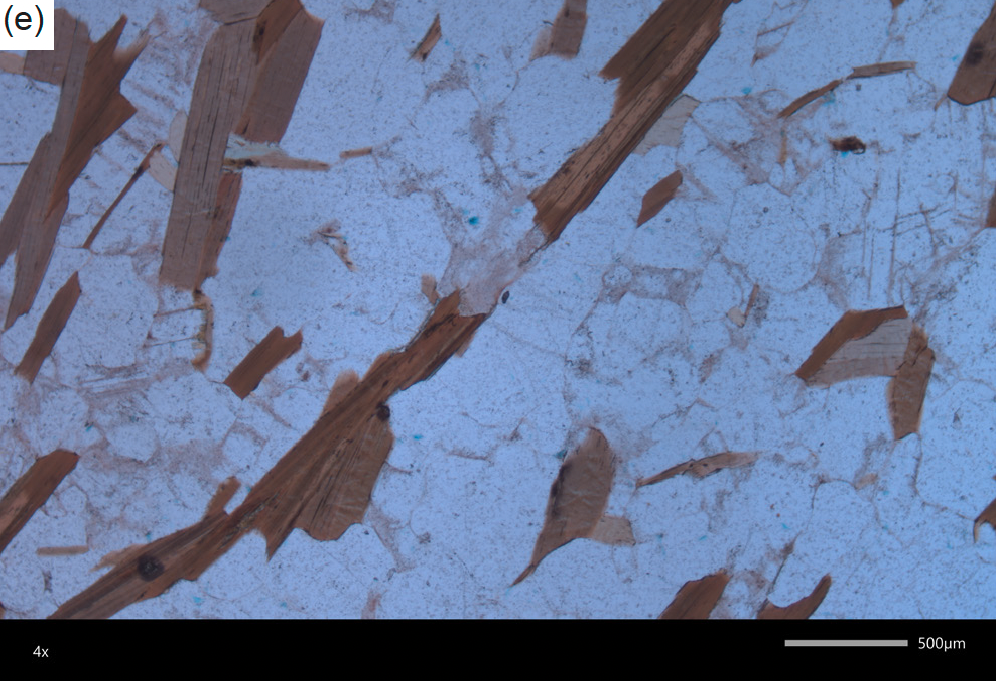 Fig. 9 shows what samples from several granite plutons look like under the petrographic microscope. In plane polarized light (fig. 9a–e) the biotite flakes that host the radiohalos are brown, the various shades or intensities of brown being due to their orientation with respect to the polarizing filter and microscope stage angle. Note also that often the biotite flakes are elongated and aligned which has resulted in the overall foliated textures of those samples. In fig. 9d the large greenish grains are hornblende, which primarily occurs clumped with the biotite flakes in those samples in which it is found. Otherwise, the white clear grains are quartz, while the “dirty”-looking white grains are plagioclase, the “dirtiness” being due to the minor alteration to which plagioclase is susceptible. Plagioclase is more abundant in the Ruby pluton sample (fig. 9d) in which the hornblende occurs, so it is a tonalite compared to the other samples which are granodiorite. Fig. 9f is the same view as fig. 9e but under crossed polarized light in which the quartz grains display various shades of yellow and gray depending on the crystal lattice orientations of the grains and their orientations on the microscope stage.