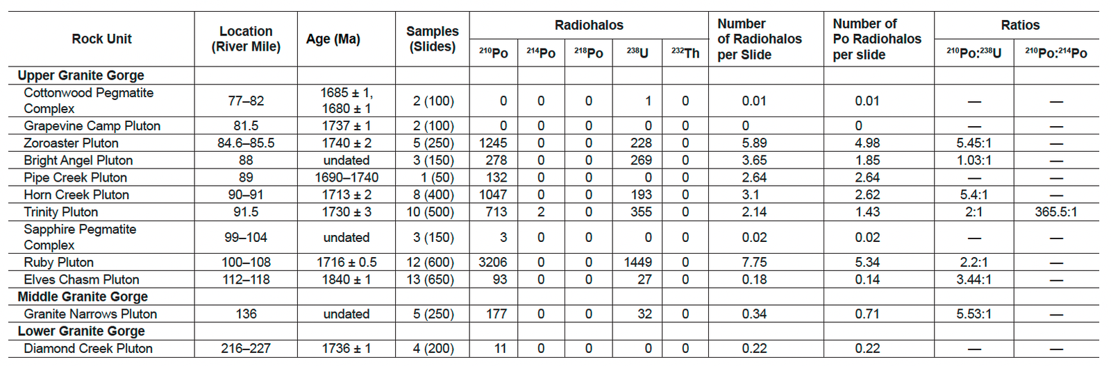 Table 3. Summary of the radiohalos counted in all samples of each of the Precambrian granite plutons and pegmatite complexes in the Upper, Middle and Lower Granite Gorges.